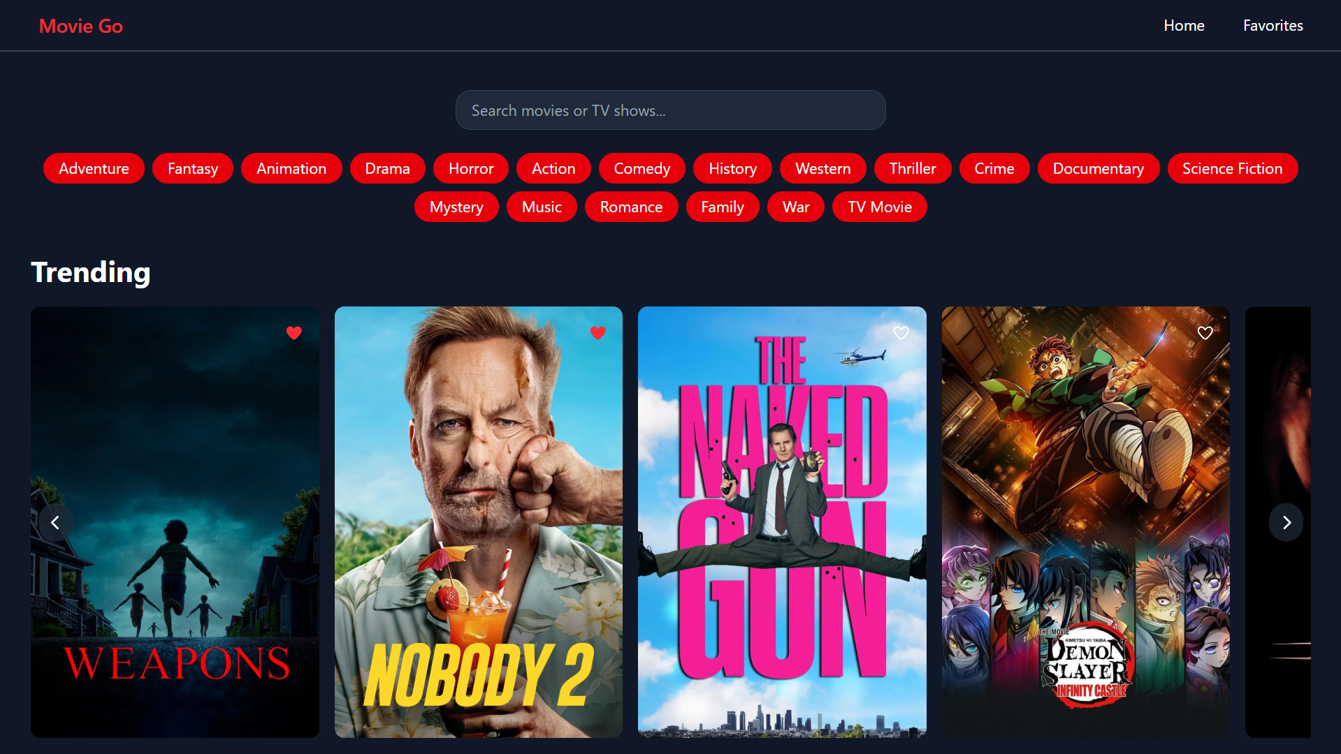MovieGo is a React-based web app that lets you discover, explore, and save your favorite movies. Powered by The Movie Database (TMDB) API, it provides detailed movie information including posters, ratings, genres, and descriptions in a modern, responsive UI.